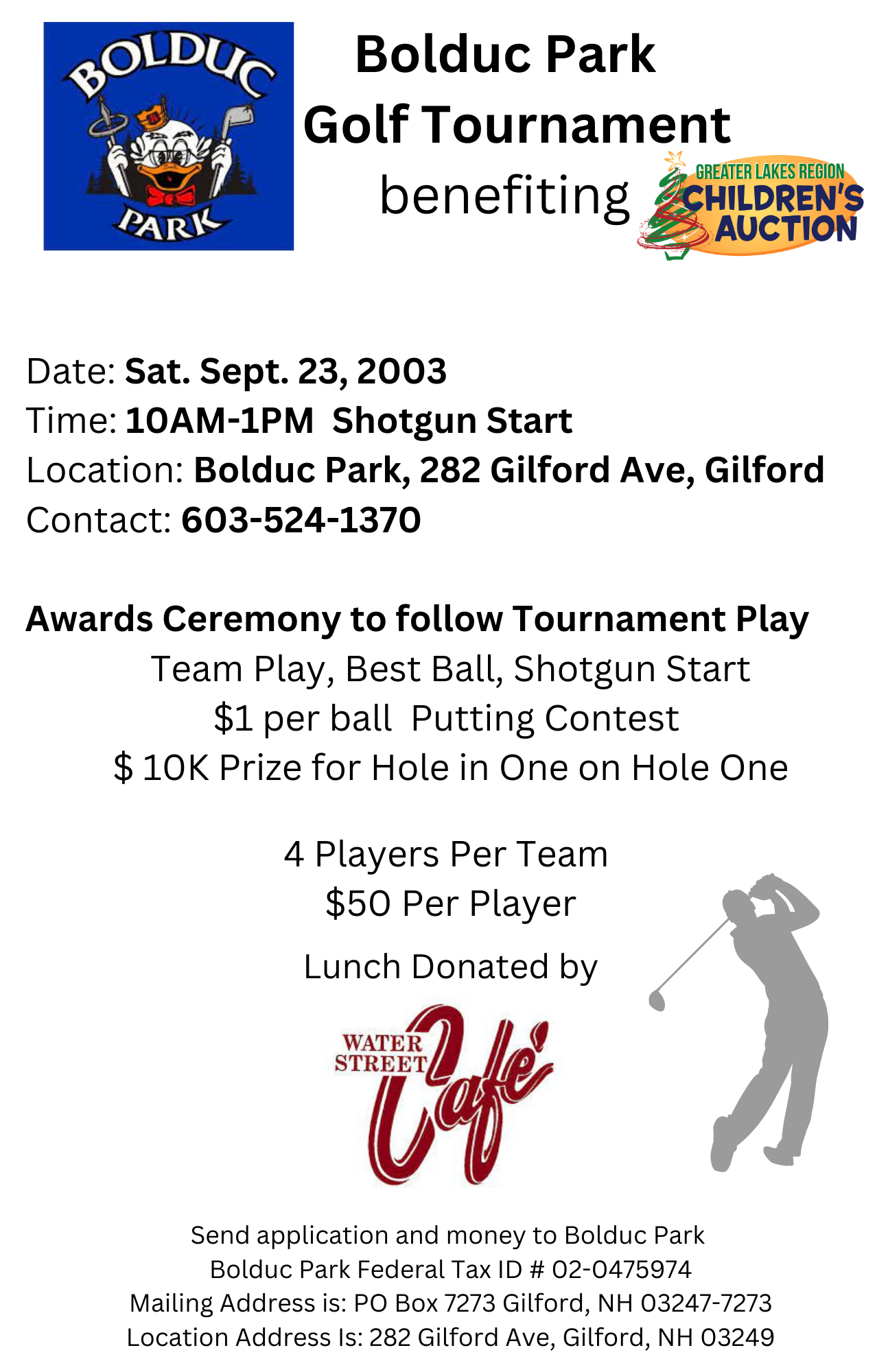 Bolduc Park is hosting a Shot Gun Start 9 Hole Golf Tournament to benefit the Greater Lakes Region Children's Auction on Saturday, September 23, from 10am-1pm. Many prizes, lunch provided by Water Street Cafe, and lots of fun. This tournament is open to anyone who wants to play whether you have a foursome or not!