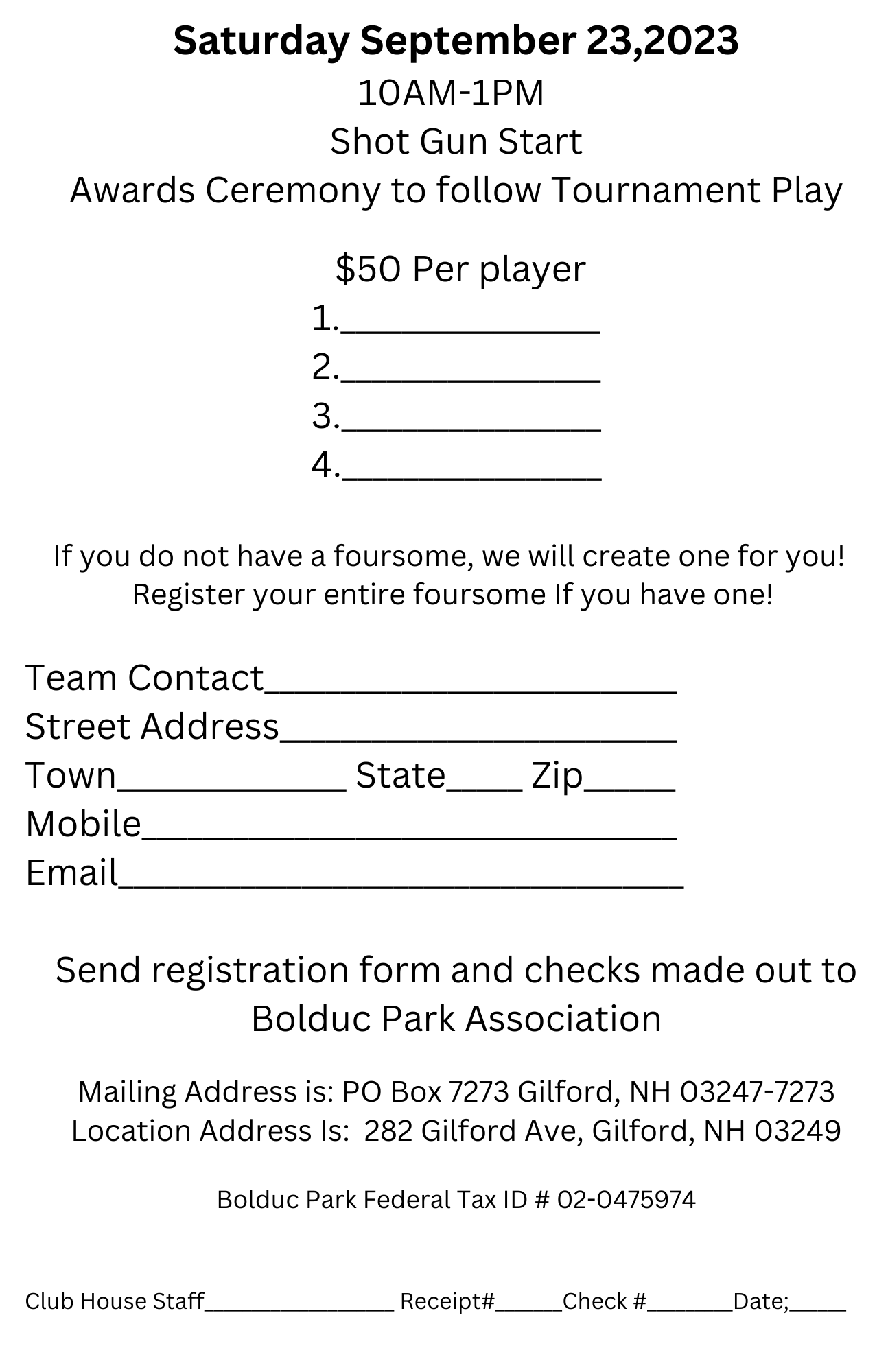 Join Bolduc Park for a great golf tournament benefitting the Greater Lakes Region Children's Auction on Saturday, September 23 from 10AM- 1PM. Great prizes, $10K for a hole in one on hole one, Lunch provided by Water Street Cafe and more! Register alone, with friends, or with a foursome!