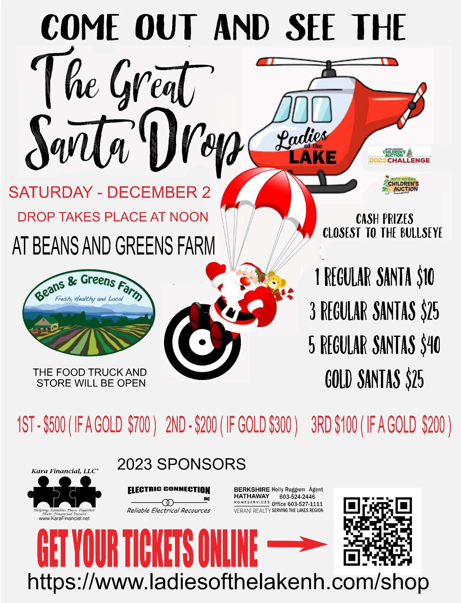 at Beans and Greens Farm in Gilford at noon. The Santas drop at noon so buy your Santa tickets for $10 per Santa! Each ticket matches a number on the back of a Santa that is being dropped. If your Santa is one of the 3 closest to the bullseye you win a cash prize!